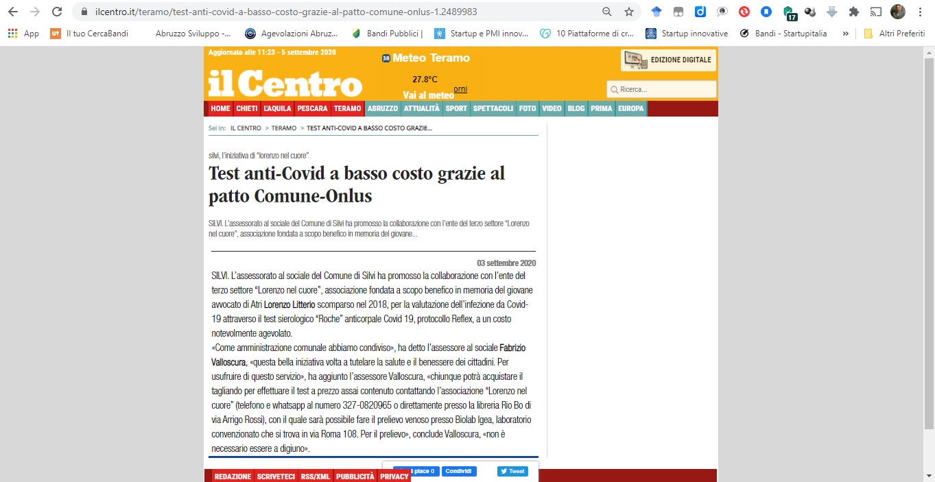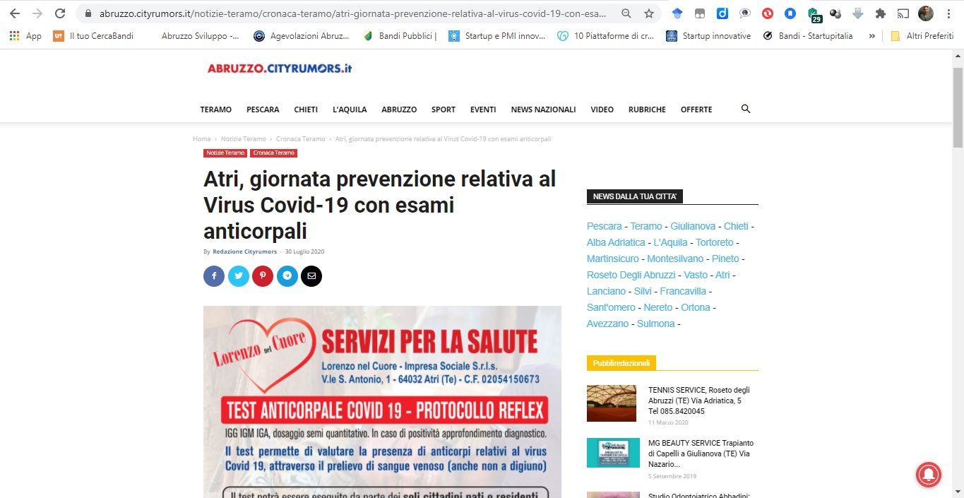 L'iniziativa di "Lorenzo nel Cuore" con il Comune di Silvi (Te) per l'avvio di test sierologici a costo agevolato alla popolazione locale.