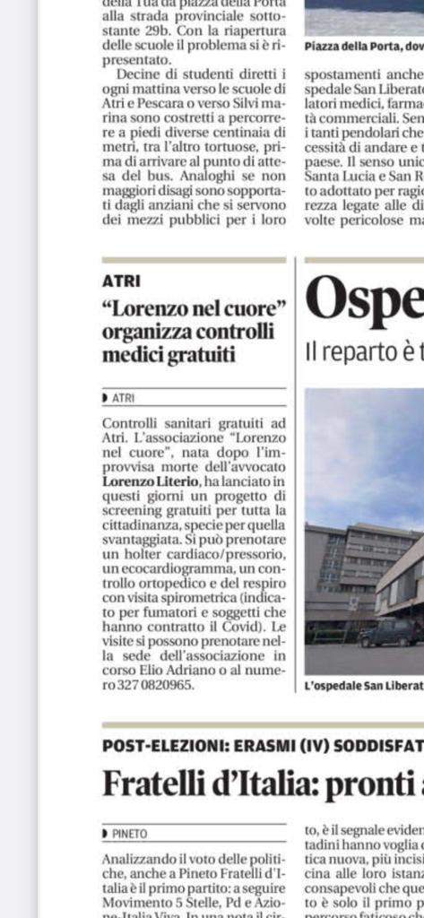 Ecco l'articolo apparso sul quotidiano "Il Centro" d'Abruzzo che parla del progetto "Lorenzo nel Cuore" ad Atri che offre servizi medico-sanitari gratuiti alla popolazione locale in ricordo del nostro Lorenzo Literio.